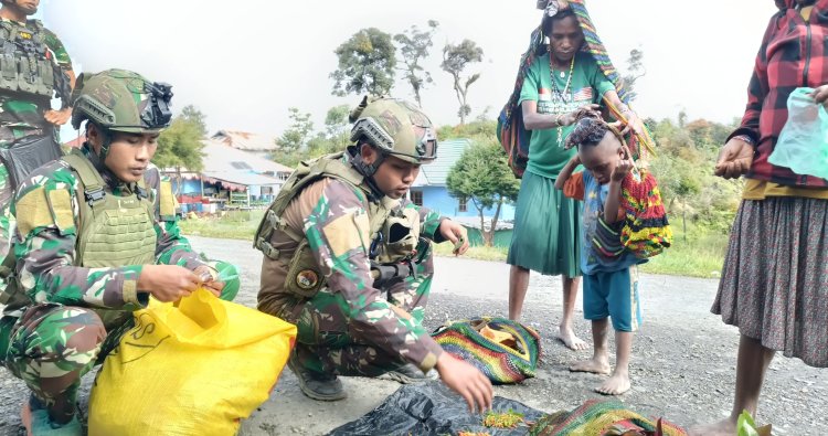 INTAN JAYA - Senyum merekah di wajah para 'mama-mama Papua' saat personel Satgas Pamtas RI–PNG Mobile Yonif 500/Sikatan mendatangi lapak jualan mereka di sepanjang Jalan Poros Sugapa–Beoga, Kampung Mamba, Distrik Sugapa, Kabupaten Intan Jaya, pada Selasa (20/1/2026). Bukan sekadar kunjungan biasa, melainkan sebuah aksi nyata bertajuk ROSITA (Borong Hasil Tani).