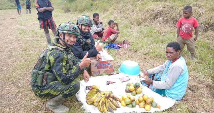 Sejak mentari pagi menyapa, para Mama-mama Papua telah bersemangat menata berbagai hasil panen mereka: sayuran segar yang hijau, buah-buahan lokal yang menggoda selera, serta umbi-umbian khas pegunungan yang menjadi sumber kehidupan. Suasana pasar yang biasanya tenang, seketika menjadi lebih semarak dengan kedatangan para prajurit.