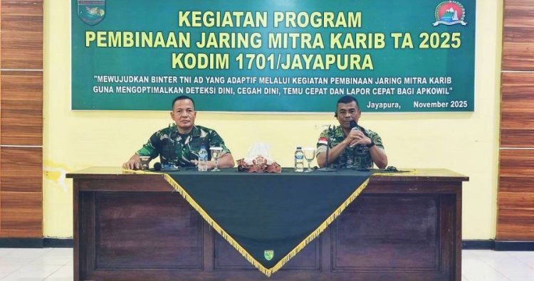 Jayapura – Kodim 1701/Jayapura memperkuat peran tokoh masyarakat sebagai mata dan telinga di lapangan melalui kegiatan Pembinaan Jaring Mitra Karib TNI AD TA 2025, yang digelar di Aula Makodim 1701/Jayapura, pada Jum'at (28/11/2025).
