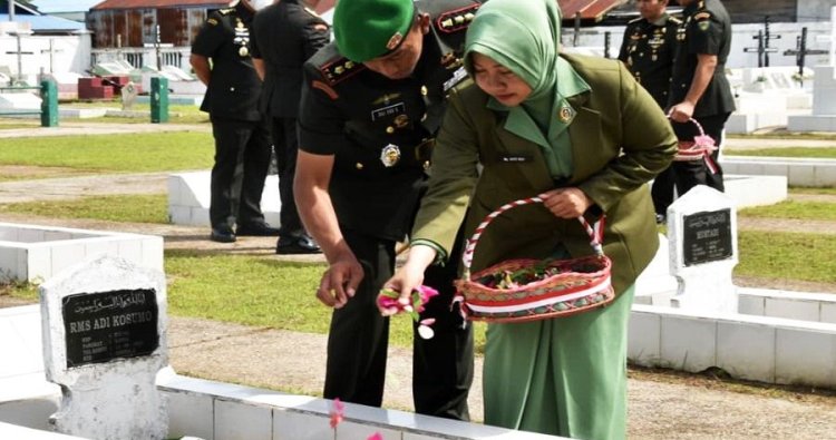 Merauke - Dalam suasana khidmat dan penuh rasa hormat, Komandan Kodim 1707/Merauke Letkol Czi Dili Eko Setyawan, S.Ak., M.Han bersama Ketua Persit KCK Cabang XVI Kodim 1707/Merauke Ny. Asti Dili Eko Setyawan mengikuti Upacara Ziarah Rombongan dalam rangka peringatan Hari Ulang Tahun ke-21 Korem 174/ATW, Senin (24/11/2025). Upacara digelar di Taman Makam Pahlawan Trikora, Jln. TMP Trikora, Kota Merauke, Kab. Merauke - Provinsi Papua Selatan.