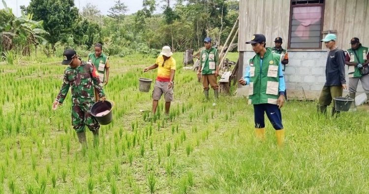 Keerom – Dalam upaya mendukung peningkatan produksi pertanian dan ketahanan pangan nasional, Babinsa Koramil 1701-06/Senggi, Sertu Yasir Nurhidayat kembali melaksanakan pendampingan kepada para petani di wilayah binaannya. Bersama Kelompok Tani (Poktan) MCM dan Penyuluh Pertanian Lapangan (PPL) dari BPP Distrik Senggi, Sertu Yasir terjun langsung ke lahan sawah untuk melakukan pemupukan tahap pertama tanaman padi varietas Impari 30 milik petani binaan, Bapak Suroso. Kegiatan berlangsung di Jalur 8 SP 2, Distrik Senggi, Kabupaten Keerom, Senin (3/11/2025).