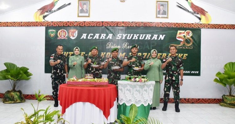 Merauke – Papua Selatan. Kodim 1707/Merauke menggelar acara Syukuran Hari Ulang Tahun (HUT) ke-58 Tahun 2026 pada Selasa, 20 Januari 2026, bertempat di Aula Anim Ha Makodim 1707/Merauke, Jalan Raya Mandala, Kabupaten Merauke. Kegiatan berlangsung khidmat dan penuh kebersamaan. Acara diawali pemutaran video singkat yang menampilkan berbagai kegiatan Kodim 1707/Merauke baik program terpusat maupun kegiatan teritorial yang bersinergi dengan Pemerintah Daerah serta instansi terkait.