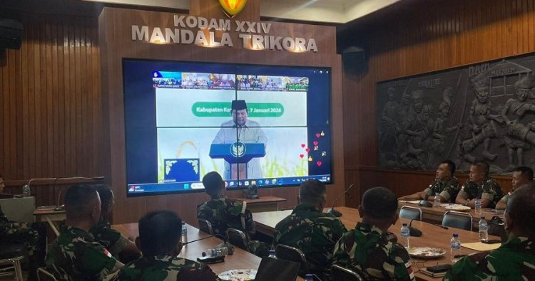 Merauke – Pangdam XXIV/Mandala Trikora, Mayjen TNI Lucky Avianto, S.I.P., M.Si., mengikuti kegiatan Panen Raya dan Pengumuman Swasembada Pangan Nasional bersama Presiden Republik Indonesia secara virtual, Rabu (07/01/2026). Kegiatan nasional tersebut dipusatkan di Kabupaten Karawang, Jawa Barat, dan diikuti jajaran Kodam XXIV/Mandala Trikora dari Ruang Rapat Mandala, Makodam XXIV/Mandala Trikora, Merauke, Provinsi Papua Selatan.