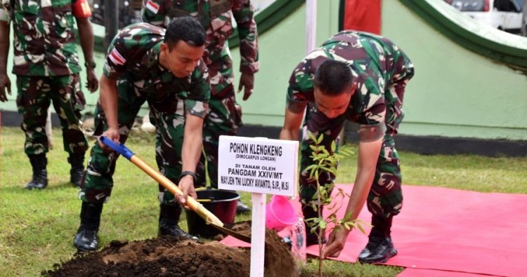 Panglima Kodam XXIV/Mandala Trikora Mayjen TNI Lucky Avianto, S.I.P., M.Si., bersama Ketua Persit KCK Daerah XXIV/Mandala Trikora Ny. Dian Lucky Avianto, melaksanakan penanaman pohon kelengkeng di depan Kantor Makodim 1707/Merauke yang berlokasi di Jln. Raya Mandala, Kota Merauke, Kabupaten Merauke – Provinsi Papua Selatan. Senin (27/10/2025).
