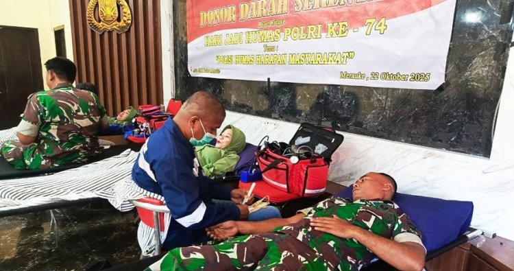 Dalam rangka memperingati Hari Jadi Humas Polri ke-74 Tahun 2025 dengan tema ”Polisi Humas Harapan Masyarakat”, puluhan Prajurit TNI dan Persit Kartika Chandra Kirana Cabang XVIII Kodim 1707/Merauke turut ambil bagian dalam kegiatan donor darah serentak yang digelar di Aula Sarja Arya Racana Polres Merauke, Jalan Brawijaya, Kabupaten Merauke - Provinsi Papua Selatan. Rabu (22/10/2025).