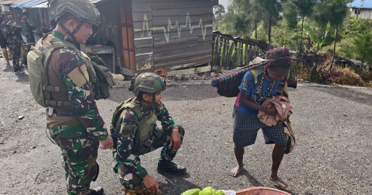 INTAN JAYA - Di tengah dinginnya kabut pagi yang menyelimuti Sugapa, Intan Jaya, Papua Tengah, sebuah kehangatan tak terduga menyelimuti Jalan Poros Sugapa–Beoga. Para prajurit dari Satgas Pamtas RI-PNG Mobile Yonif 500/Sikatan tak hanya berjaga, namun juga sigap membantu para mama Papua mengangkat noken dan karung berisi hasil kebun segar di titik-titik yang biasa mereka lalui menuju Pasar Yokatapa. Senin (24/11/2025).