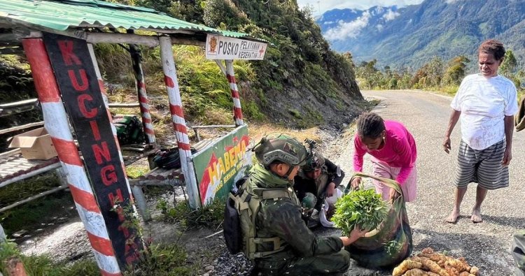 Pemandangan akrab terlihat di sepanjang jalan menuju pasar. Seragam loreng berpadu dengan noken dan karung berisi hasil bumi. Percakapan hangat mengalir, tawa riang terdengar. Tak sedikit mama-mama Papua yang tak kuasa menahan haru; dagangan mereka ludes terjual bahkan sebelum tiba di tujuan.
