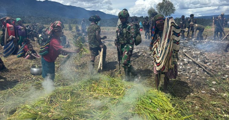 LANNY JAYA - Dalam suasana khidmat yang menyelimuti Kampung Nenggeagin, Kabupaten Lanny Jaya, Papua Pegunungan, prajurit Satgas Yonif 408/Sbh dari Pos Nenggeagin tak tinggal diam. Mereka turut hadir dan membaur dalam prosesi adat bakar batu yang diselenggarakan sebagai penghormatan terakhir bagi almarhum Nai Talenggen.