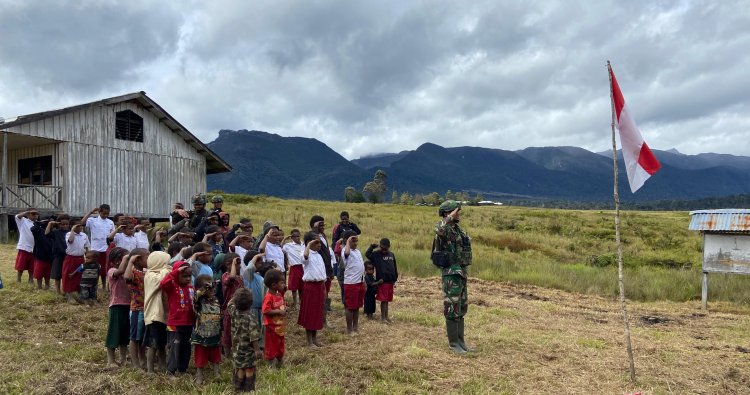 LANNY JAYA - Suasana ceria menyelimuti halaman SD Nenggeagin, Papua, Kabupaten Lanny Jaya, pada Rabu (19/1/2025). Para siswa dengan semangat mengikuti setiap instruksi Peraturan Baris Berbaris (PBB) yang diberikan oleh personel Satgas Yonif 408/Sbh. Kegiatan ini menjadi bagian dari upaya pembinaan wawasan kebangsaan yang menyentuh hati anak-anak di Distrik Nenggeagin.