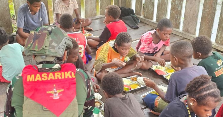 ASMAT - Di tengah denyut kehidupan pedalaman Mumugu, Kabupaten Asmat, Papua Selatan, sebuah inisiatif mulia diluncurkan oleh Satgas Pamtas Mobile Yonif 733/Masariku. Program bertajuk “Masariku Peduli Gizi” hadir untuk menyentuh langsung masa depan anak-anak Papua, dimulai dari SD Rimba YPPK Yan Smith Santo Aloysius Mumugu 2. Program ini bukan sekadar pembagian makanan, melainkan jembatan kepedulian antara para prajurit dan harapan generasi penerus bangsa.