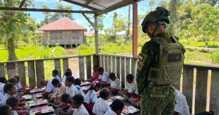 INTAN JAYA - Di tengah hamparan hijau pedalaman Intan Jaya, Papua Tengah, aroma masakan hangat kini menggantikan kesunyian hutan. Halaman SD Rimba YPPK Yan Smith Mumugu 2 menjadi saksi bisu hadirnya kehangatan tak terduga. Bukan dentuman senjata, melainkan denting panci dan sendok yang dibawa oleh para prajurit Satgas Pamtas Mobile Yonif 733/Masariku. Kamis (13/11/2025).