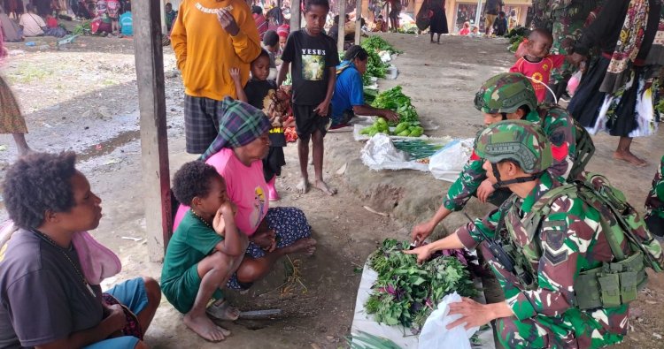 Lapak-lapak sederhana yang dipenuhi kekayaan alam pegunungan Papua, mulai dari sayur-mayur segar hingga umbi-umbian, menjadi saksi bisu interaksi hangat ini. Para prajurit dengan ramah menyusuri setiap sudut pasar, memilih dan membeli produk-produk yang menjadi sumber penghidupan utama warga.