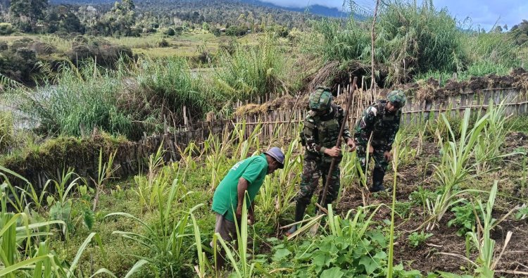 Dalam suasana yang penuh kekeluargaan, personel satgas menyambangi Elis Tabuni, seorang petani setempat yang tengah tekun menggarap lahannya. Percakapan mengalir tanpa pretensi, menciptakan jembatan komunikasi yang erat antara aparat keamanan dan warga pedalaman. Momen sederhana di kebun ini menjadi bukti nyata bahwa kehadiran TNI bukan sekadar penjaga, melainkan juga sahabat yang siap mendengarkan dan memahami denyut nadi kehidupan masyarakat.