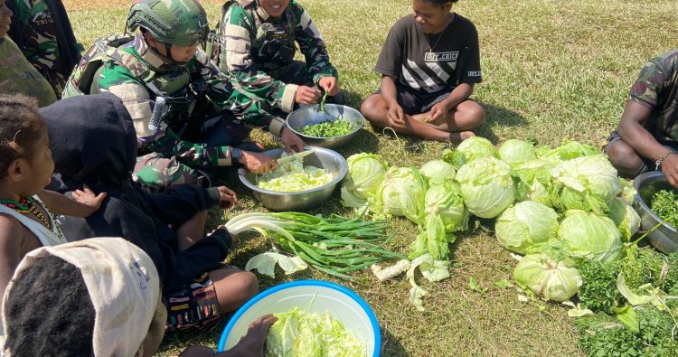 Tanpa jarak, tanpa sekat, prajurit TNI terlihat duduk bersama warga, bahu-membahu membersihkan dan menyiapkan hasil kebun untuk hidangan. Aktivitas yang seharusnya menjadi rutinitas harian para mama Papua, mendadak berubah menjadi ruang perjumpaan yang penuh makna. Kebersamaan ini bukan sekadar kegiatan fisik, melainkan wujud nyata pendekatan humanis yang digagas Satgas Yonif 408/Sbh, sebuah upaya membangun kepercayaan melalui sentuhan langsung pada kehidupan sehari-hari masyarakat.