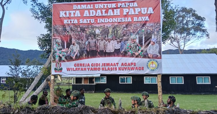 LANNY JAYA - Di tengah kehangatan matahari terik Wano Barat, tepatnya di halaman Gereja GIDI Kampung Andugume, Kabupaten Lanny Jaya, Papua Pegunungan, sebuah pesan kuat terpampang jelas pada Senin (15/12/2025). Satgas Yonif 408/Sbh melalui Pos Andugume tidak hanya hadir, tetapi juga turut menyuarakan semangat persatuan melalui pemasangan banner bertema perdamaian. Tertulis dengan tinta gagah, “Damai Untuk Papua, Kita Adalah Papua, Kita Satu Indonesia Raya”, banner ini menjadi bukti nyata upaya komunikasi sosial yang menyentuh hati.