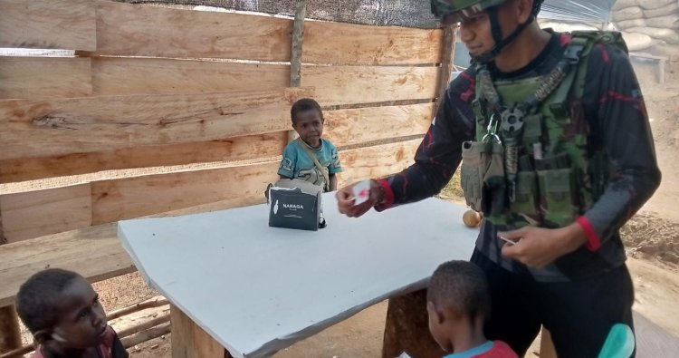 Sorot mata anak-anak Zanepa seketika berbinar ketika menerima suguhan manis dari para prajurit. Tawa riang dan senyum lebar mereka menjadi bukti betapa sederhana sebuah kebahagiaan bisa diraih. Momen ini pun disambut hangat oleh tokoh masyarakat setempat, Bapak Karpus Wandagau.