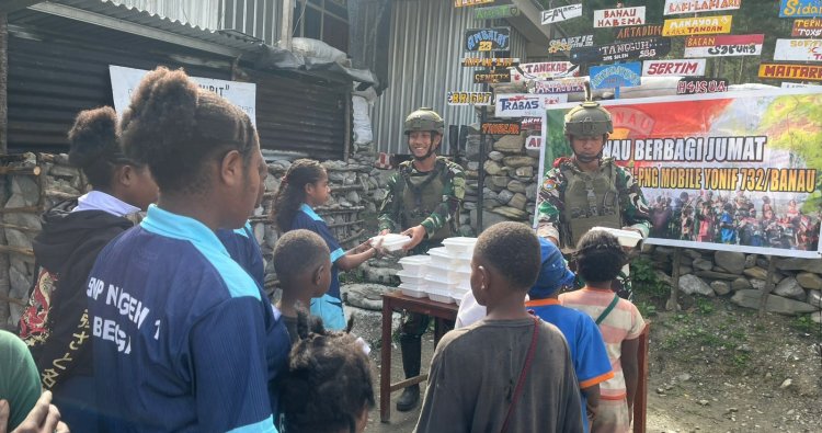 PUNCAK - Kehangatan menyelimuti Kampung Milawak di Distrik Beoga, Kabupaten Puncak, Papua Tengah, ketika personel Pos Beoga dari Satgas Pamtas RI-PNG Yonif 732/Banau menggelar program "Banau Berbagi Jumat". Kegiatan yang berlangsung pada Jumat (14/11/2025) ini bertujuan untuk mempererat tali silaturahmi dan menyebarkan kepedulian kepada masyarakat setempat, khususnya para generasi penerus bangsa.