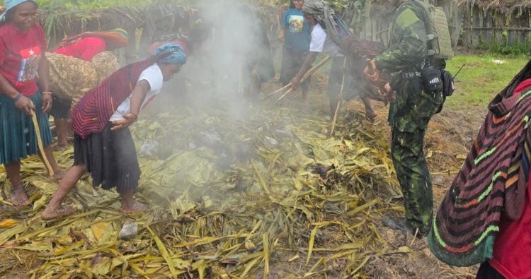 PUNCAK - Di tengah kehangatan api yang membakar batu, Tentara Nasional Indonesia (TNI) tidak hanya hadir sebagai penjaga keamanan, tetapi juga sebagai bagian tak terpisahkan dari denyut nadi kehidupan masyarakat Papua. Minggu (28/12/2025) menjadi saksi bisu bagaimana prajurit TNI turut larut dalam suka cita tradisi sakral Bakar Batu di Distrik Ilaga, Kabupaten Puncak, Papua Tengah. Kegiatan ini, yang serentak digelar di tiga kampung, bukan sekadar ritual adat, melainkan manifestasi rasa syukur, persatuan, dan kehangatan persaudaraan yang kian membara.