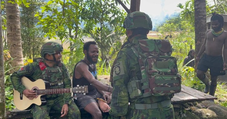 Tak hanya berhenti pada pemberian bantuan materi, personel Satgas juga menghadirkan keceriaan dengan mengajak warga bernyanyi bersama lagu-lagu kebangsaan. Gema melodi nasional yang mengalun di Kampung Nonggoloid menjadi sarana ampuh untuk merajut kebersamaan, menumbuhkan rasa cinta tanah air, dan mempererat ikatan persatuan di antara anak bangsa.