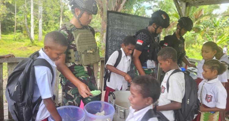 ASMAT - Di tengah keheningan hutan belantara Papua Tengah, tepatnya di SD Rimba YPPK Yan Smith Mumugu 2, Distrik Krepkuri, Kabupaten Asmat, sebuah kisah kemanusiaan yang mengharukan terbentang. Prajurit Satgas Pamtas Mobile Yonif 733/Masariku tak hanya hadir sebagai penjaga keamanan, namun juga sebagai pembawa secercah harapan melalui program "Masariku Peduli Gizi". Selasa (11/11/2205) pagi itu, nasi hangat, lauk pauk segar, dan sayuran olahan sendiri menjadi penyejuk bagi anak-anak Papua yang jarang merasakan makanan bergizi.