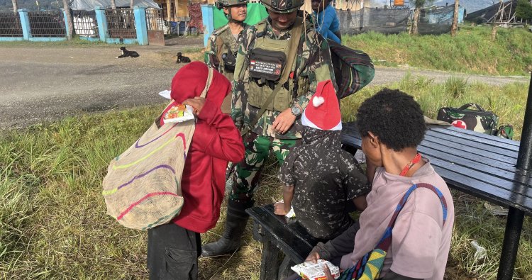 INTAN JAYA - Personel TNI dari Satgas Pamtas Mobile Yonif 500/Sikatan menghadirkan suasana sukacita menjelang Natal bagi warga Kampung Mamba, Distrik Sugapa, Kabupaten Intan Jaya, Papua, Senin (1/12/2025). Di ruas Jalan Poros Sugapa–Beoga, prajurit membagikan topi Sinterklas dan buku doa rohani bertajuk Doa Pengharapan kepada masyarakat yang melintas maupun tengah beraktivitas.