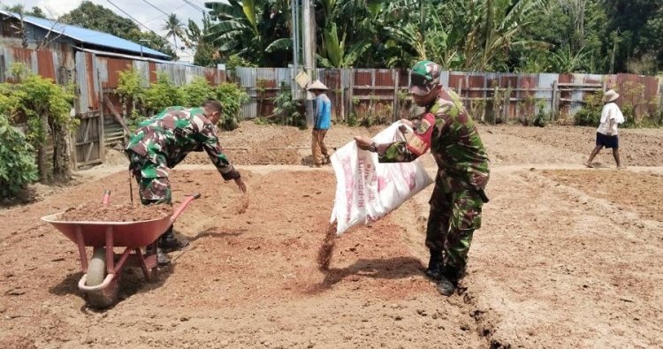 Kegiatan tersebut dilakukan bersama Bapak Andri, salah satu petani setempat, dalam tahap penyiapan lahan dan penaburan pupuk yang nantinya akan ditanami berbagai jenis sayuran konsumsi, seperti kangkung, bayam, dan sawi. Pendampingan ini merupakan bagian dari upaya Koramil 1701-01/Sentani dalam membantu petani meningkatkan hasil produksi pertanian sekaligus mendukung ketersediaan pangan lokal yang berkelanjutan.